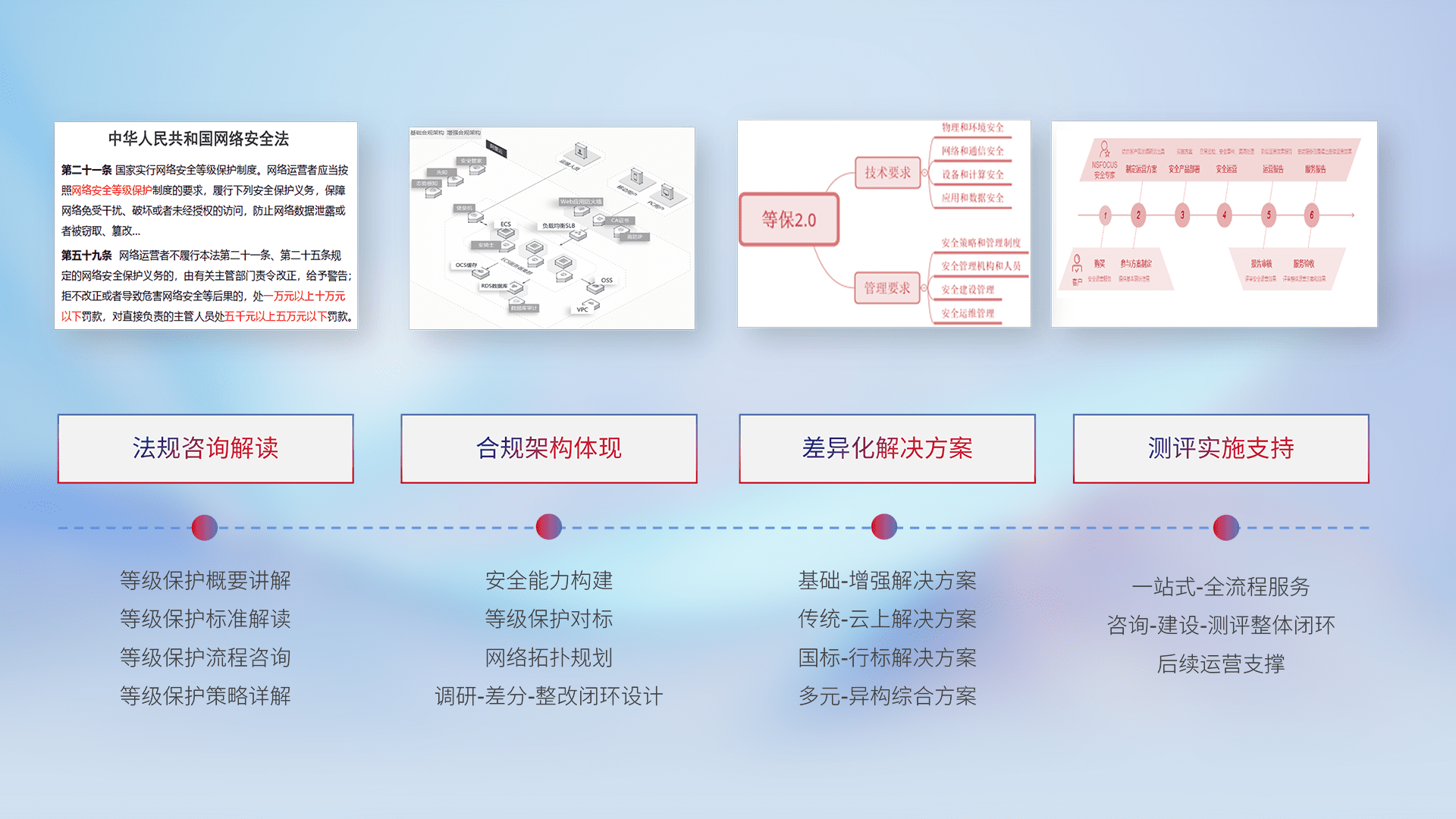 通过专业的法律咨询解读、、、、合规架构体现、、、、差异化解决方案、、、、测试实施支持等服务,,,,为客户量身打造等保合规体系。。。。